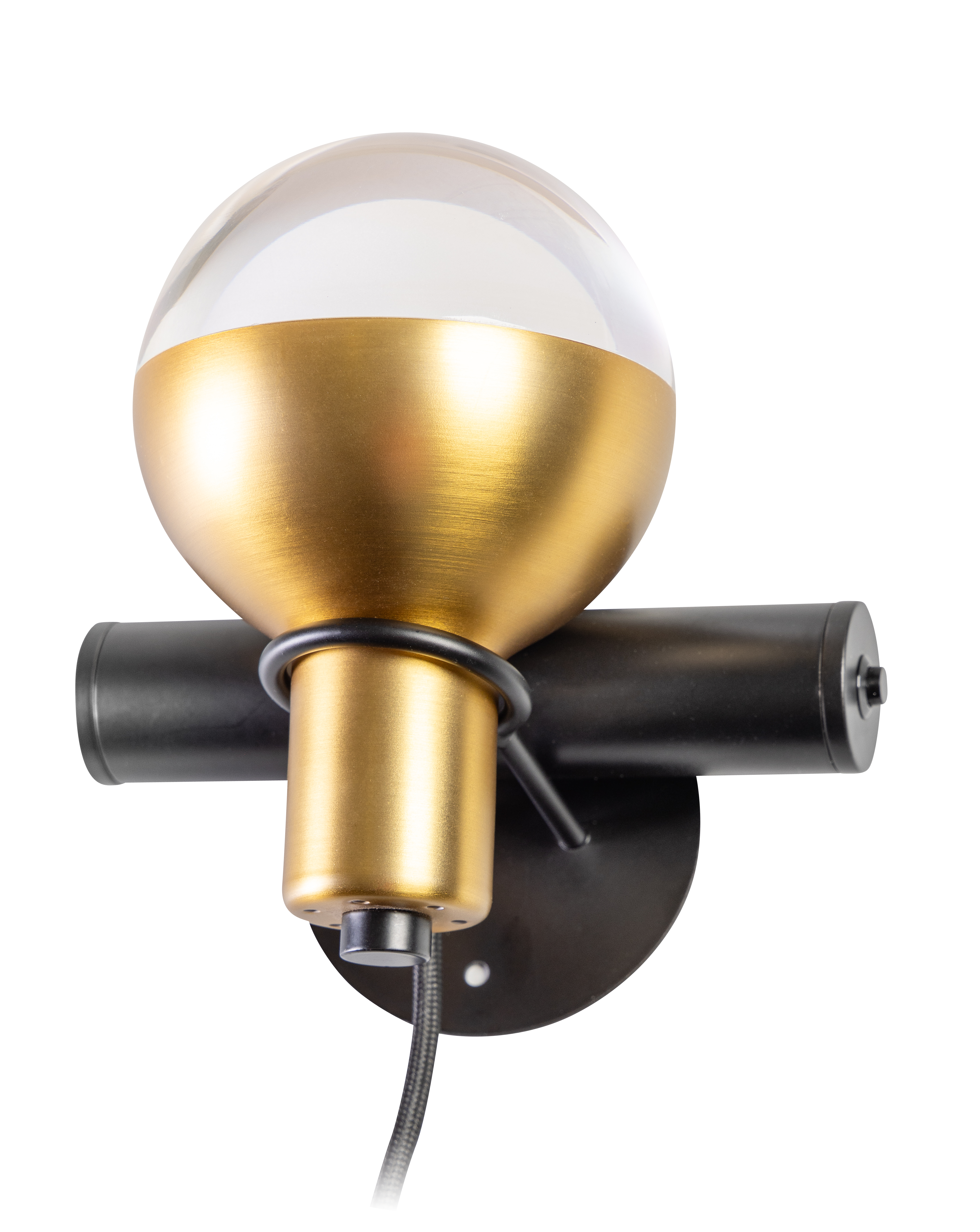 Bronzen wand of tafellamp in combinatie met zwart en helder/mat glas. 1x GU10 fitting. Doorsnee 10cm. Hoog 15cm.