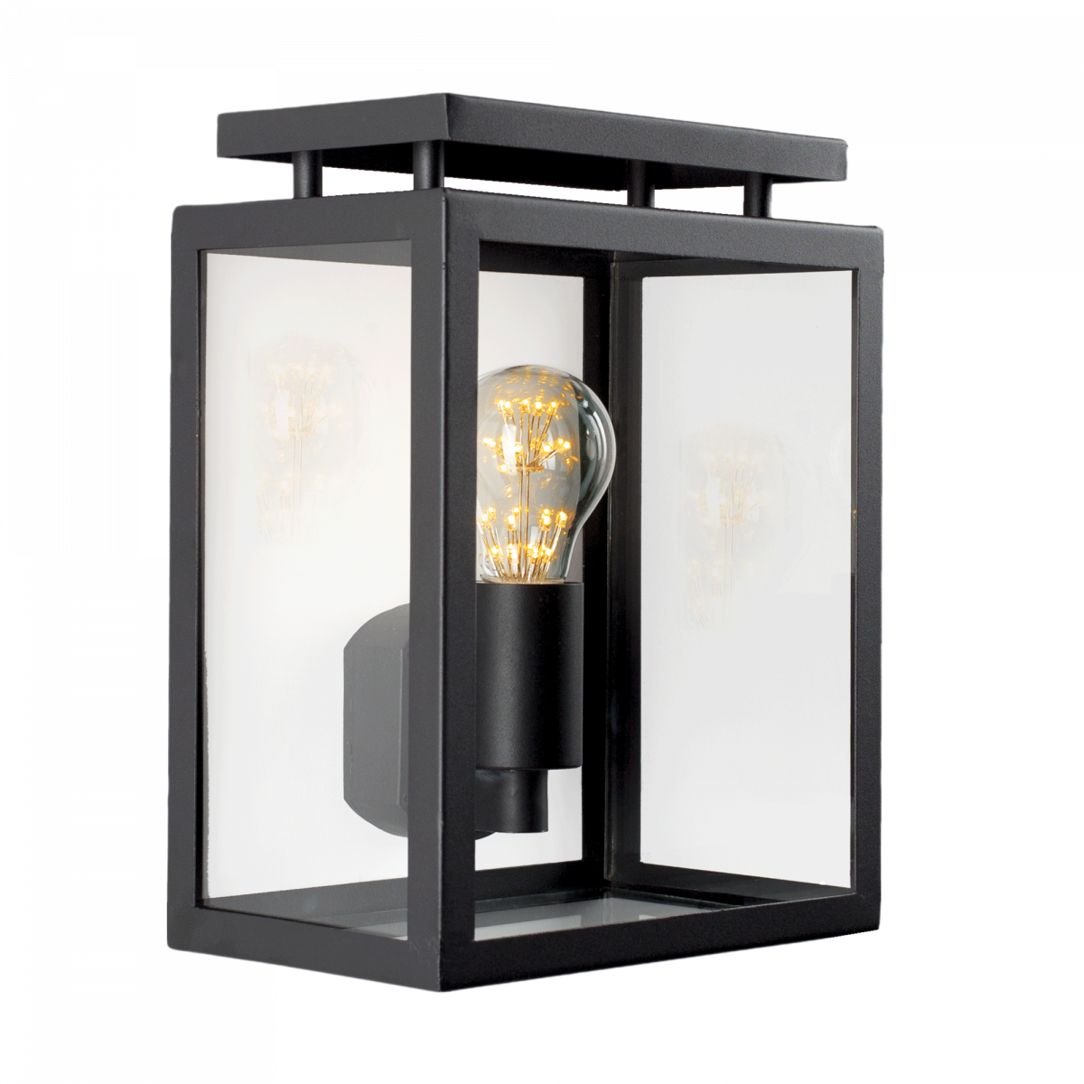 Zwarte rvs buiten wandlamp. 1xE27. Geschikt voor led verlichting. Hoog 28cm. Breed 22cm. Diep 13,5cm.