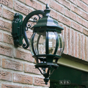 Donkergroene buiten wandlamp. 1xE27. Geschikt voor led verlichting. Hoog 42cm. Breed 16cm. Diep 27cm.