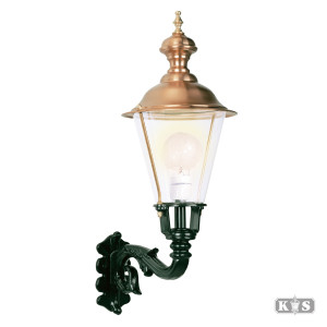 Donkergroene buiten wandlamp met koperen kop. 1xE27. Geschikt voor led verlichting. Hoog 63cm. Breed 22cm. Diep 29cm.