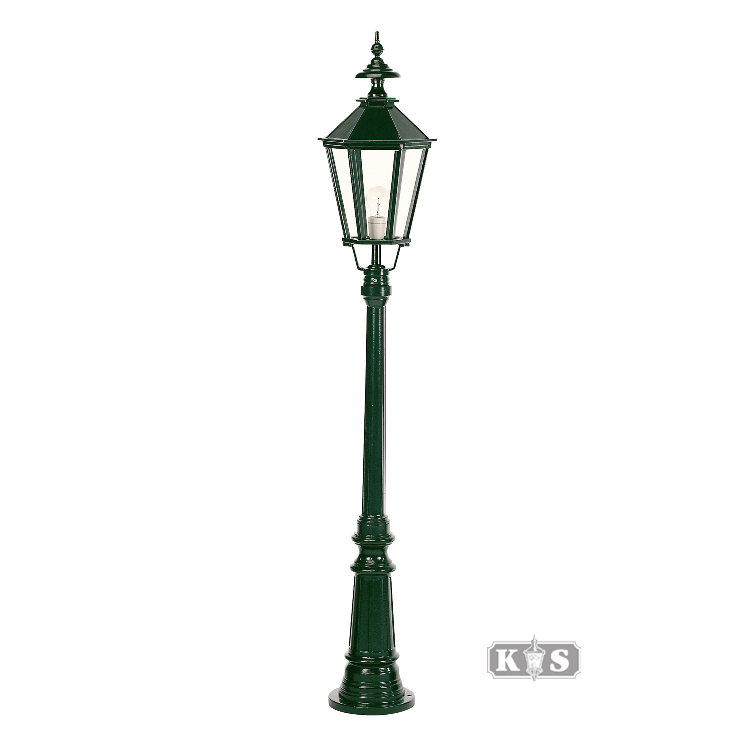 Donkergroene zeskant buiten lantaarn. 1xE27. Geschikt voor led verlichting. Hoog 1.66cm. Doorsnee kap 22cm. Garantie 3 jaar.