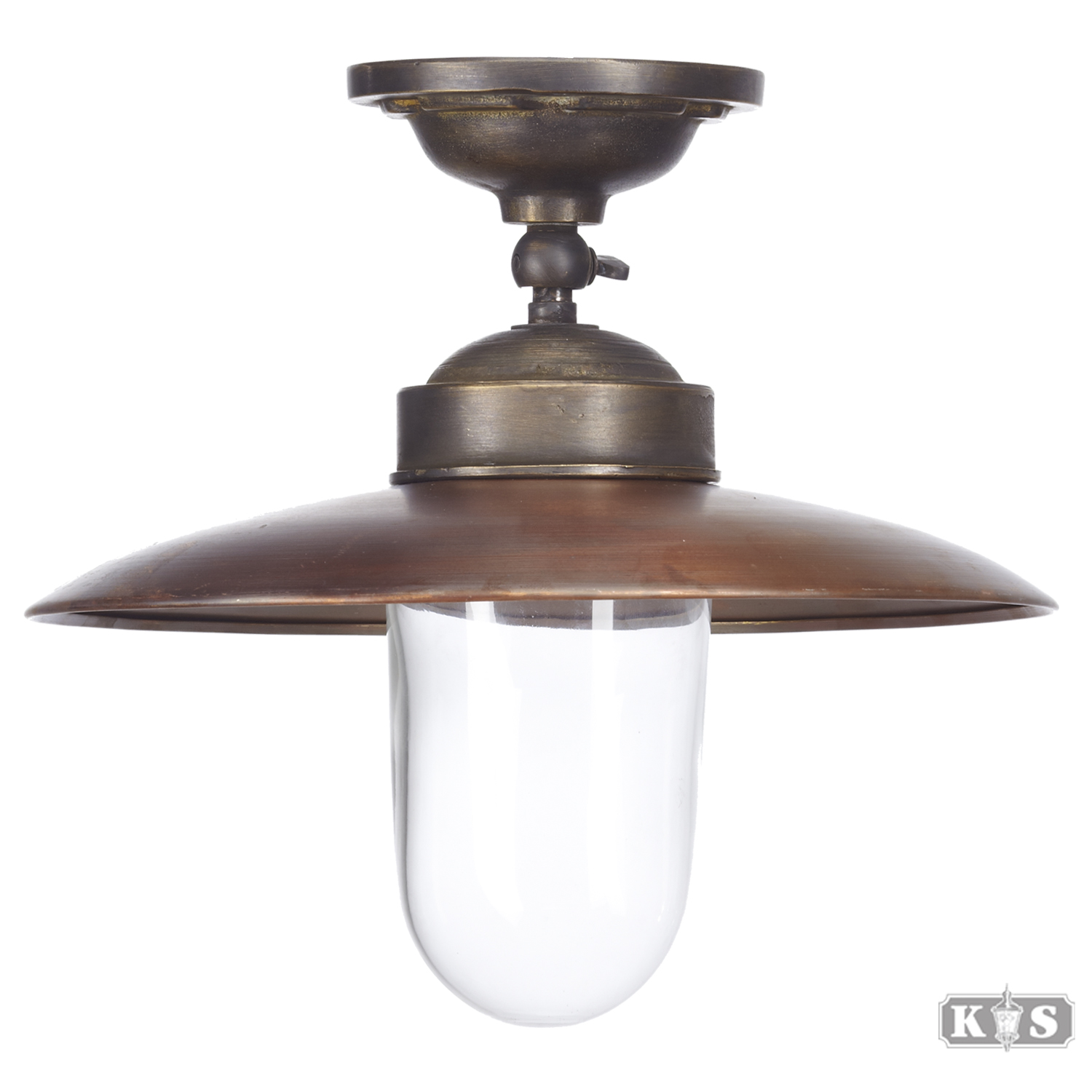 Bronzen plafond of wandlamp met rood koperen kap en helder glas. De lamp is voorzien van een kogelgewricht. 1xE27. Geschikt voor led verlichting. Hoog 37cm. Doorsnee 31cm. Garantie 3 jaar.