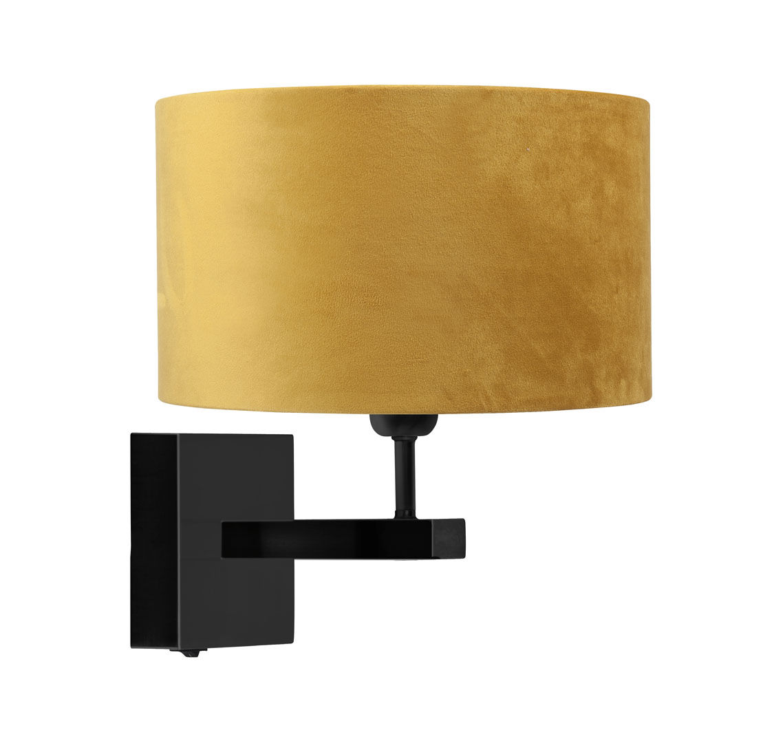 Zwarte metalen wandlamp met oker fluwelen kap. 1xE27. Geschikt voor led verlichting. Doorsnee kap 25cm. Hoog totaal 35cm.